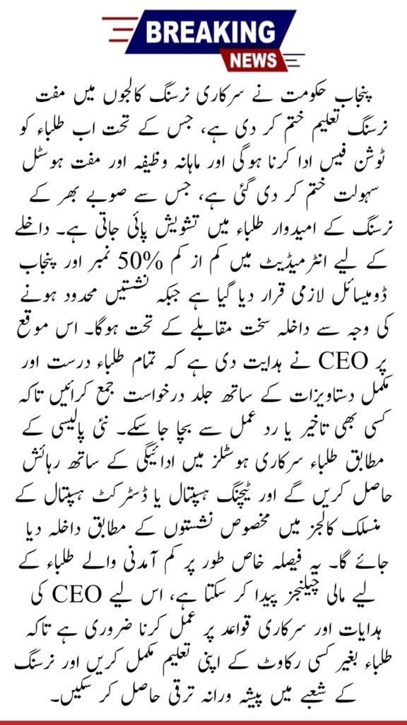 The Punjab government’s decision to end free nursing education in public colleges marks a major shift in healthcare education policy. While admissions remain open to students with 50% marks in Intermediate and Punjab domicile, the introduction of fees, removal of stipends, and paid hostel facilities may significantly impact aspiring nurses. Students are advised to carefully review the new requirements before applying to nursing colleges across Punjab.