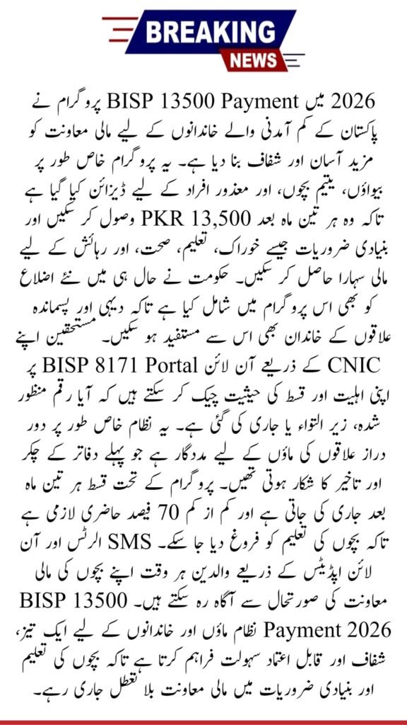 The BISP 13500 Payment 2026 is a vital financial support program under the Benazir Income Support Programme (BISP). It provides PKR 13,500 quarterly to low-income families in Pakistan, helping them cover essential needs like food, healthcare, education, and living expenses. Recently, the government expanded the program by adding new districts, allowing more families to benefit. This guide explains how to check your eligibility, understand the benefits, and make the most of this support.