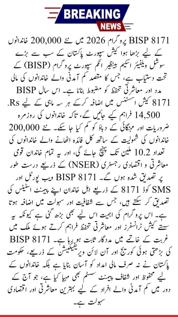 The Benazir Income Support Programme (BISP) is Pakistan’s largest social welfare program designed to help low-income families. In 2026, BISP 8171 payments have been increased, providing higher cash assistance to vulnerable households. This guide explains the new payment amounts, eligibility, verification process, and helpline information for beneficiaries.