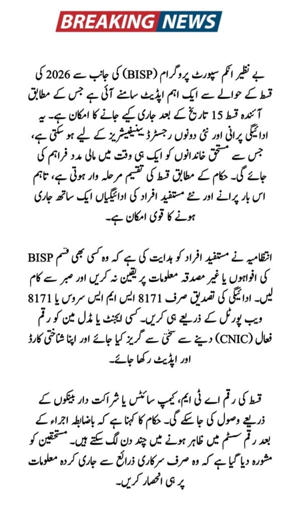 The Benazir Income Support Programme (BISP) has issued an important update regarding the upcoming installment for beneficiaries across Pakistan. According to the latest information, the next BISP installment will be released after the 15th of the month. This update applies to both existing and newly registered beneficiaries under the BISP system, including those checking their status through 8171.