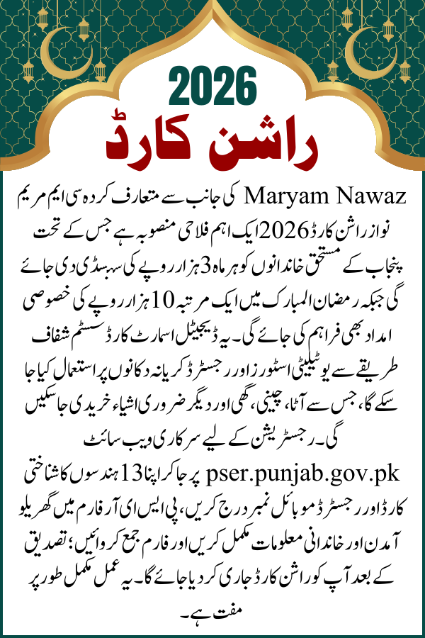 The CM Maryam Nawaz Rashan Card 2026 is a landmark initiative that provides Rs. 3,000 monthly in food subsidies to low-income families, along with a special Rs. 10,000 Ramadan grant. With a transparent digital system and province-wide coverage, this program ensures that deserving households can manage their kitchen expenses with dignity. If you are a resident of Punjab with a monthly income below Rs. 50,000, check your eligibility today by visiting the official portal pser.punjab.gov.pk or sending your CNIC to 8123. Do not delay—secure your monthly relief and make Ramadan easier for your family.