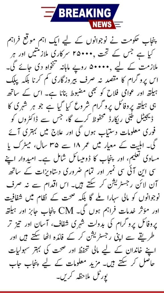 The Punjab Government’s launch of 25,000 jobs with a 50,000 salary and the Health Profile Program is a significant step toward youth employment, financial relief, and improved healthcare services. Eligible citizens should apply online through the official portal to secure these opportunities and benefit from transparent and merit-based recruitment.
