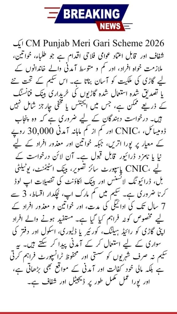The CM Punjab Meri Gari Scheme 2026 is a major public welfare initiative launched by the Punjab government to make car ownership affordable for students, women, job seekers, and low- to middle-income families. The scheme offers reduced markup, flexible installment plans, and a fully digital application process to ensure transparency and easy access.