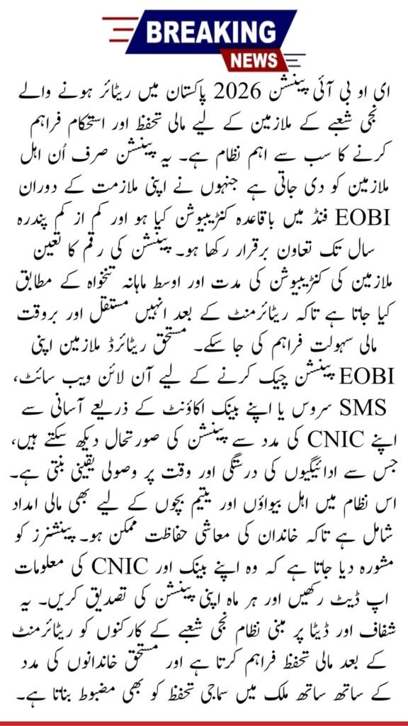 The EOBI Pension 2026 is a reliable support system for retired private-sector employees in Pakistan. Regularly checking your pension status, updating bank and personal records, and verifying contribution history ensures smooth EOBI pension payments. The program also provides essential financial assistance to widows and orphans, making it a crucial part of social security for private-sector workers.