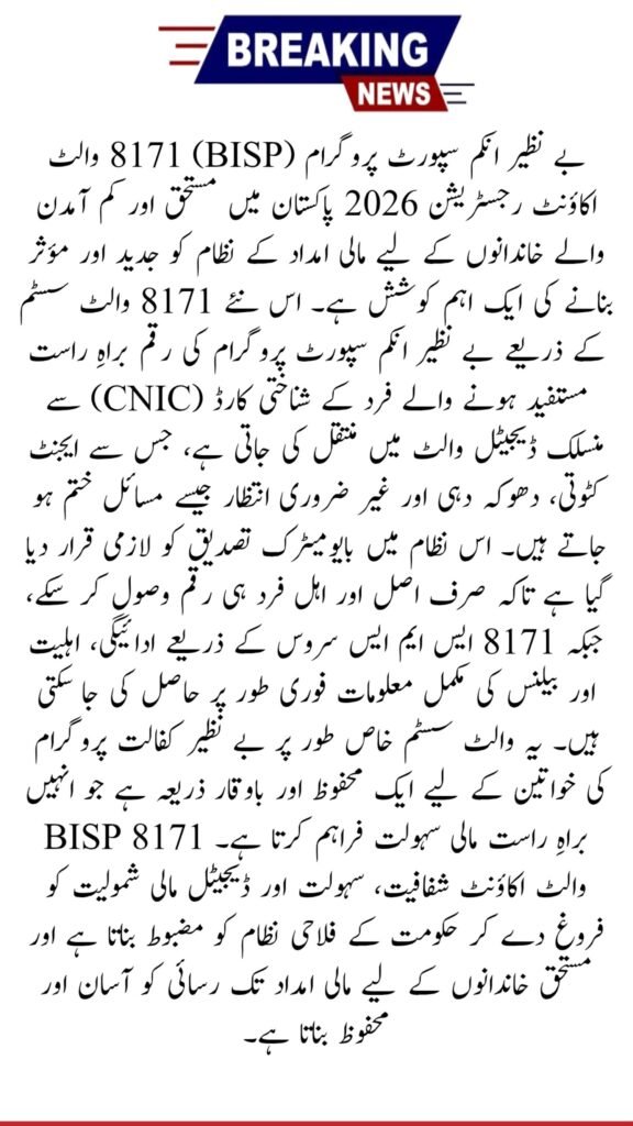 The BISP 8171 Wallet Account 2026 is a secure digital payment system for registered beneficiaries. It allows families to receive payments safely, quickly, and without waiting in long queues. This guide explains eligibility, registration steps, wallet usage, and benefits in simple words so everyone can understand and apply easily.