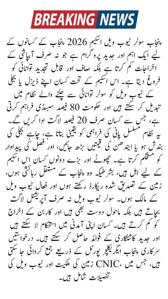 The Punjab Solar Tubewell Scheme 2026 is a valuable program for Punjab farmers. With 80% subsidy, it reduces irrigation costs, ensures continuous water supply, and promotes clean energy. Farmers can increase crop yield, lower operational costs, and adopt sustainable farming practices. The scheme is a step toward a modern, green, and profitable agriculture system in Punjab.