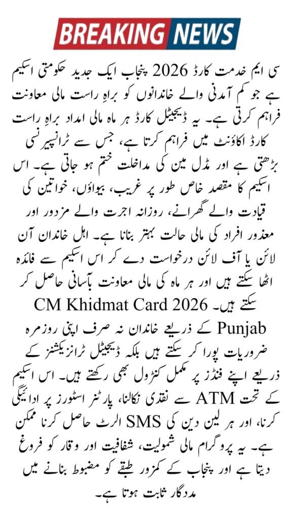The CM Khidmat Card 2026 Punjab is a secure, fast, and transparent government program providing financial assistance to low-income families. Eligible households should prepare their documents and apply online or offline to receive monthly funds. The scheme ensures financial stability, dignity, and easy access to government support.