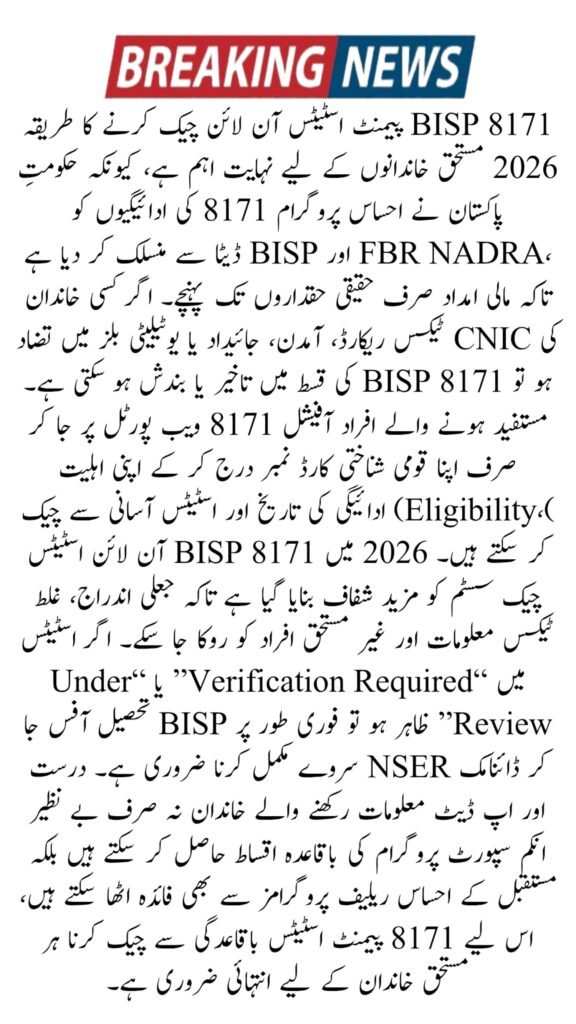 In 2026, BISP 8171 payments under the Ehsaas Program 8171 are closely linked with tax records to ensure financial support reaches the most deserving families. The government cross-checks data from FBR, NADRA, and BISP to verify income, property, and assets. Families may face delays or stoppages if tax information is incorrect or outdated. Keeping accurate financial and tax records is essential to continue receiving timely BISP 8171 payments.