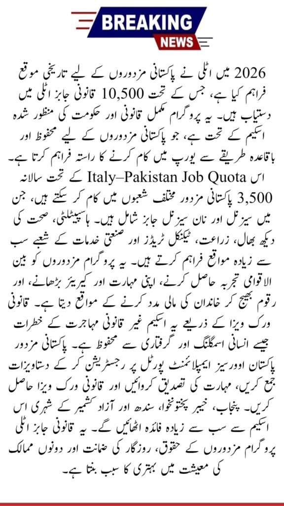 Italy has recently launched a historic employment initiative for Pakistani workers by opening 10,500 legal jobs over the next three years. This opportunity is part of a government-approved quota system, offering safe and fully regulated migration to Europe. The program allows Pakistani workers to work legally in Italy in both seasonal and non-seasonal roles, gain international experience, and contribute to family income through remittances, while Italy addresses its domestic labor shortages in key sectors.