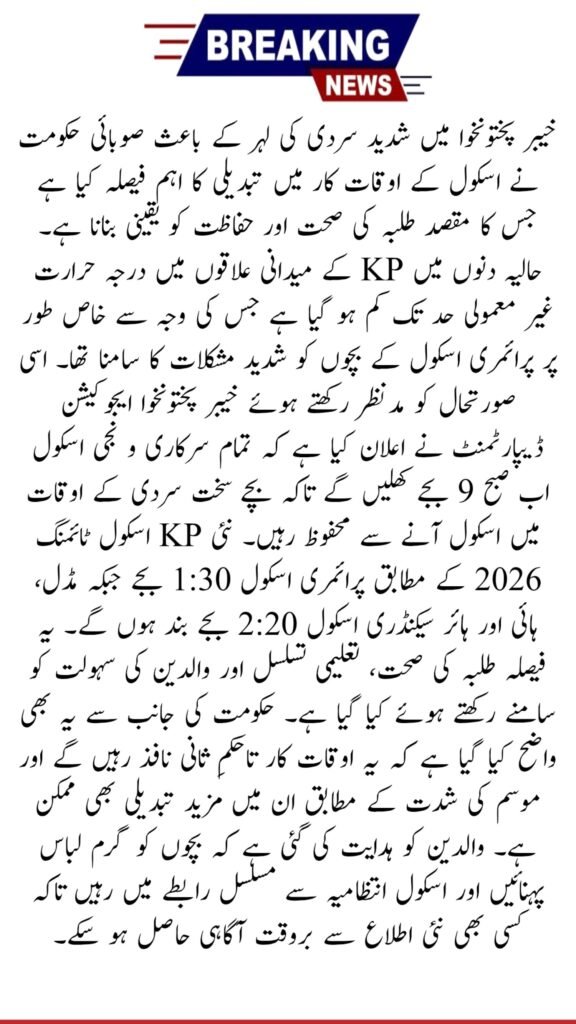 A strong cold wave in Khyber Pakhtunkhwa has forced the provincial government to take immediate action for student safety. Due to very low morning temperatures in plain areas, the KP Education Department revised school timings to protect children from harsh weather. The new schedule will be implemented after winter vacations and will remain effective until further notice.