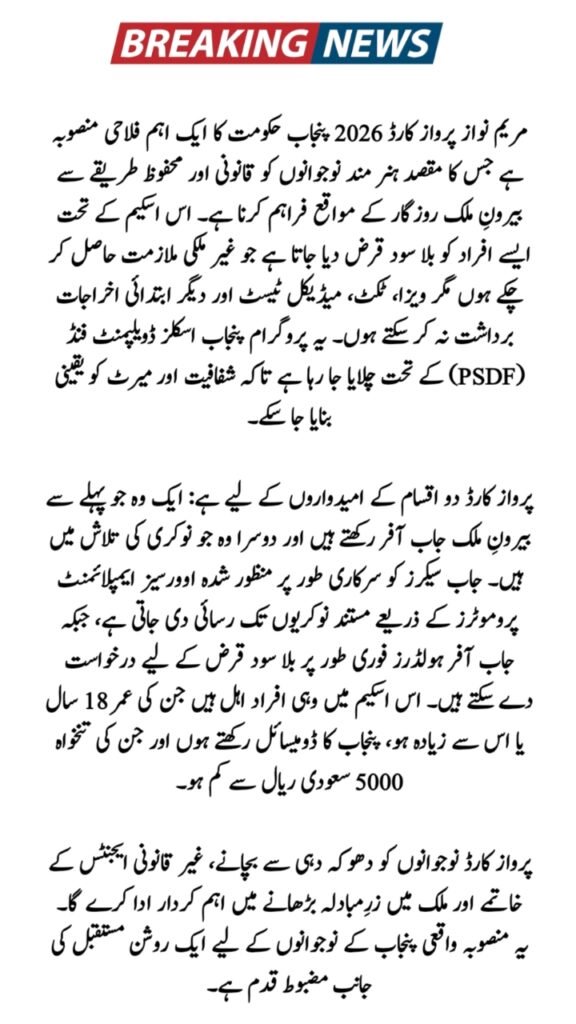 The Maryam Nawaz Parwaaz Card 2026 is a flagship welfare initiative by the Punjab Government aimed at helping skilled and semi-skilled youth work abroad legally and safely. This scheme removes financial barriers by offering interest-free loans for overseas travel expenses and also connects job seekers with verified foreign employers. The program is managed through a centralized digital system to ensure transparency, speed, and protection from fraud, making overseas employment easier for deserving candidates across Punjab.