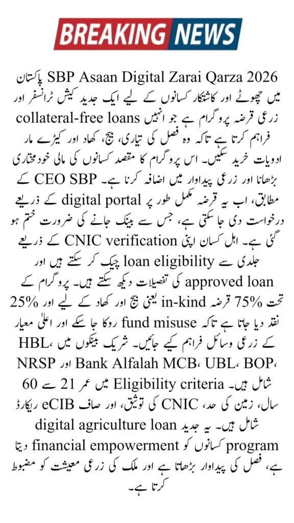 The State Bank of Pakistan (SBP) 2026 has launched the “Zarkhez-e – Asaan Digital Zarai Qarza” program to support small and subsistence farmers with collateral-free agriculture loans. This fully digital system allows farmers to apply online without visiting a bank branch. The initiative provides financial assistance, promotes higher crop yields, and encourages agriculture growth in Pakistan.