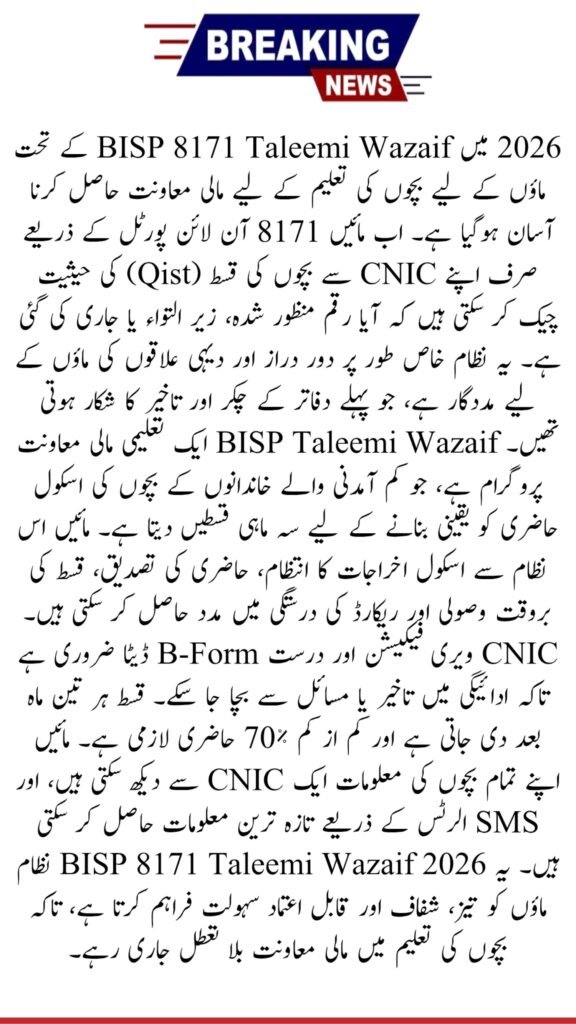 The BISP 8171 Taleemi Wazaif 2026 system offers mothers a fast, transparent, and reliable way to monitor their children’s educational support. By maintaining accurate CNIC and B-Form records, ensuring school attendance, and using the 8171 portal, mothers can secure continuous quarterly payments for their children’s education without delays.