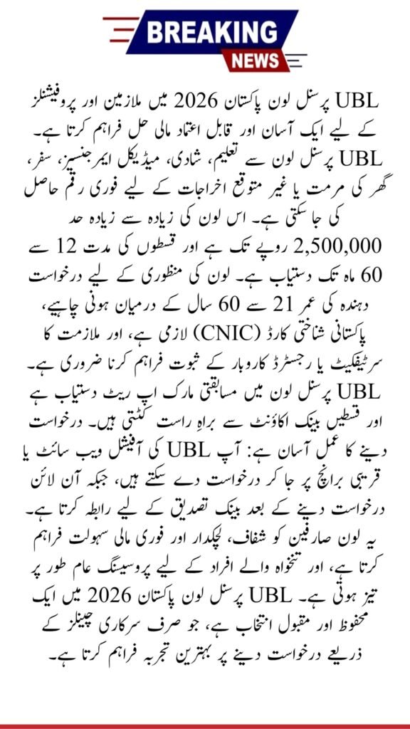 The UBL Personal Loan in Pakistan is a reliable and accessible financing option for salaried and professional individuals seeking structured financial support. With flexible loan amounts, competitive markup rates, and simple application processes, it remains a popular choice in 2026. Prospective applicants are advised to review eligibility, confirm markup and fee details, and apply only through official UBL channels for a smooth and secure borrowing experience.