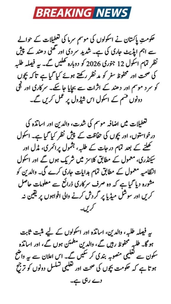 The government has issued an official update regarding the extension of winter vacations. This update confirms that schools will remain closed for a longer period due to weather conditions. The decision covers all provinces and regions without exception. Education departments have been instructed to follow this announcement strictly. Parents are advised not to trust unverified news on social media. The official update gives clear direction to schools so there is no confusion. It also ensures that all institutions follow the same schedule nationwide.
